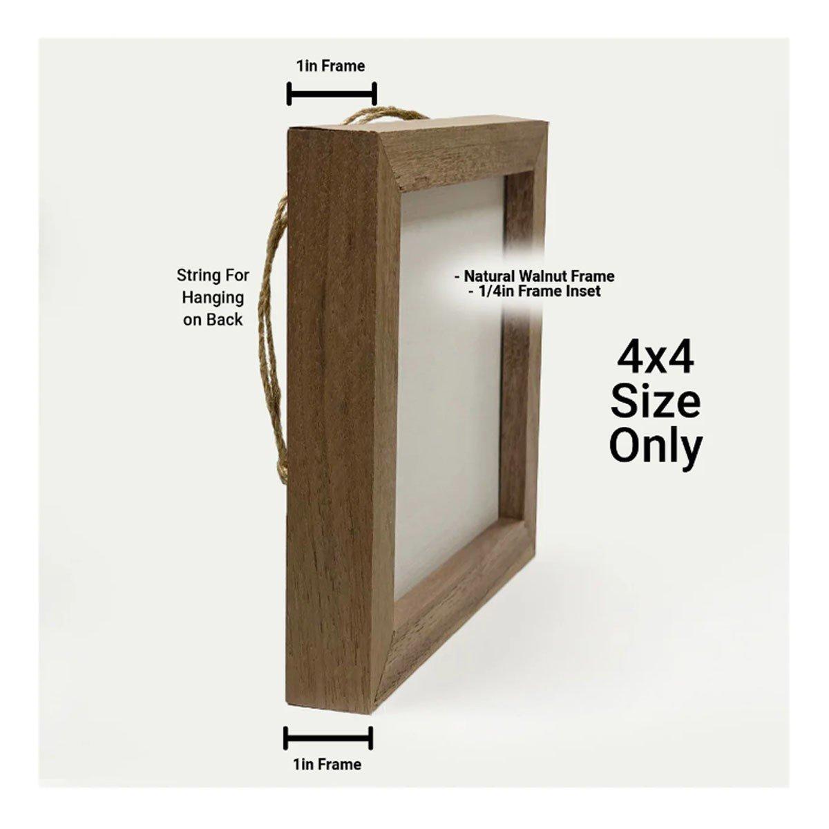 This unique piece is a simple way to bring beauty and charm to any wall or shelf within the home. It is made from high quality American hardwood planks with a hand painted face, and printed with UV cured ink, and is framed in a natural walnut frame. Each piece is unique with its own personality, marks, wood grain, and look.