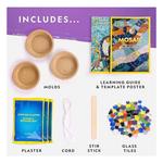You get everything you need, including mosaic molds, assorted glass tiles, cord to make wall hangings, slow-dry plaster, and easy-to-follow instructions.