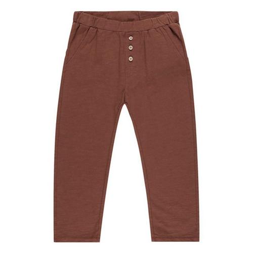 Super-soft slub knit pants with coconut button detail at center front. Featuring an elastic waistband, and a relaxed fit.