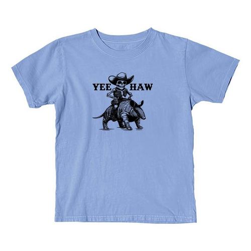 Bring a touch of Texas whimsy to your child’s wardrobe with The Youth Armadillo Yee Haw T-Shirt. Featuring a skeleton in a cowboy hat riding an armadillo, and made from soft ringspun cotton. With reinforced stitching and taped seams, it’s comfortable enough for the rodeo—or just the playground.