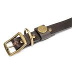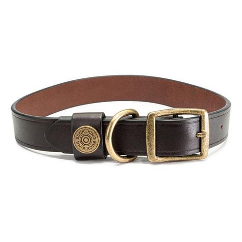 Crafted from premium chocolate brown leather for a classic and refined look. Patina Brass hardware for a touch of elegance and nostalgia. Features a Shotgun Shell case head imbedded in the collar celebrating King Buck’s heritage . Available in three adjustable comfort-fit sizes: S/M, M/L, and L/XL. 1-inch width for a perfect balance of strength and comfort. Limited Lifetime Warranty.