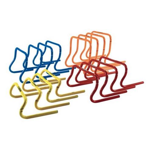 The 16A2316 Multi-Size Speed Hurdle Set is designed to help increase foot speed, agility, and fitness level. It includes 16 hurdles four 6" yellow hurdles, four 9" red hurdles, four 12" blue hurdles, and four 15" orange hurdles. The carry bag makes transportation and storage easy.
