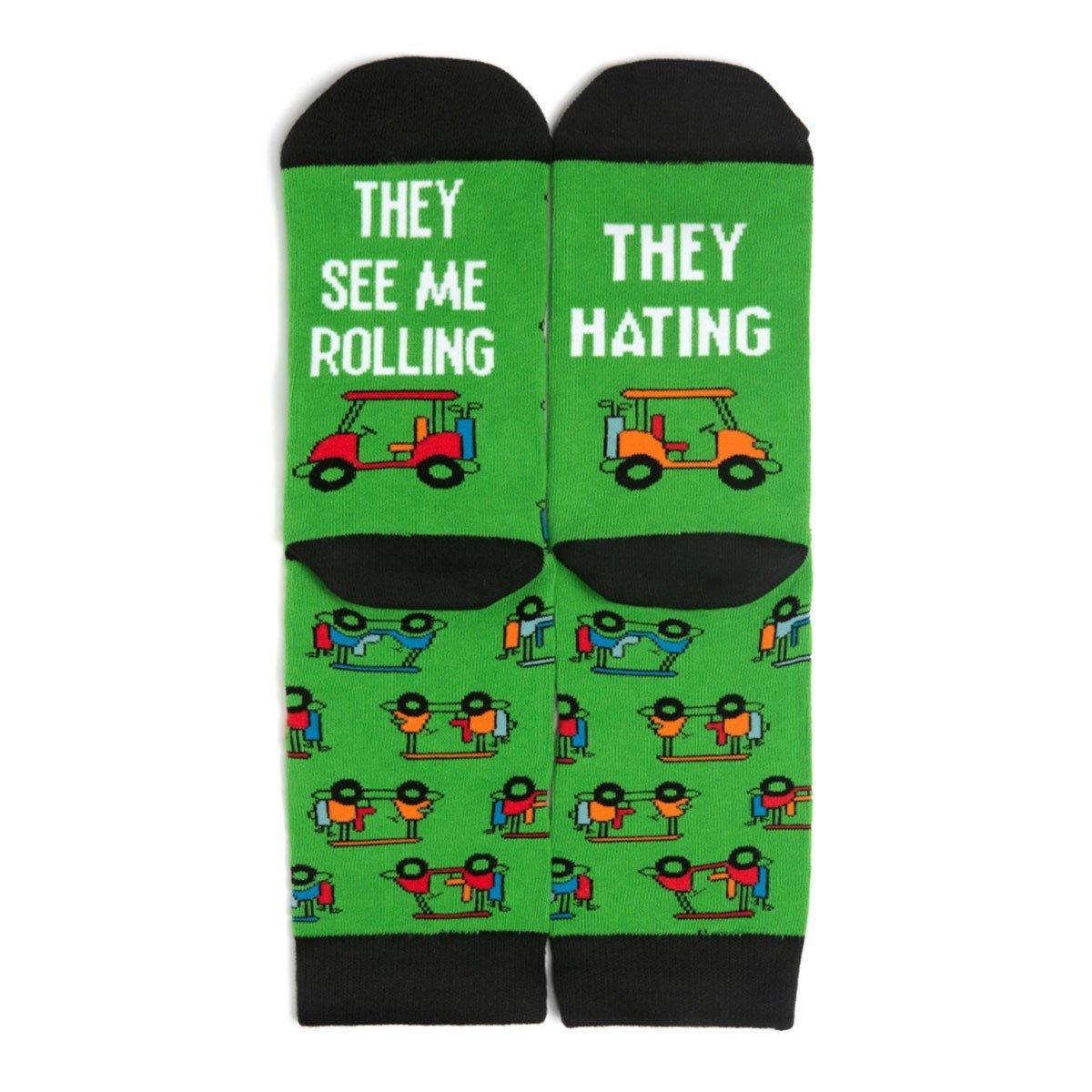 You can’t hate on these funny golf socks for men and women! Featuring an original pattern of colorful golf carts, plus a funny secret message on the bottoms: “They See Me Rolling, They Hating”! Our socks are knit from a soft, luxurious cotton blend that’s super comfy and made to last. They’re a perfect gift for golfers, and they’ll laugh every time they put them on - at work, at home, or on the course.