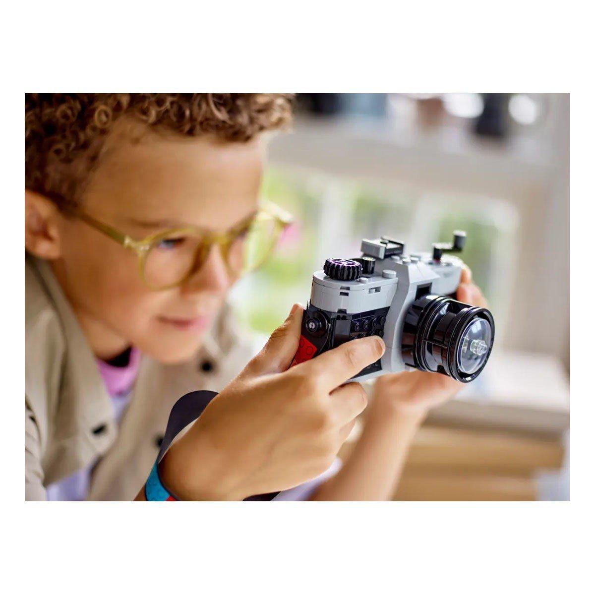Inspire imaginative play with the LEGO® Creator Retro Camera (31147) 3in1 building set for boys and girls aged 8+. This iconic camera toy features a moving lens, buttons on the top to take a photo, an opening back to place a brick-built piece of film inside and a multicolored textile strap to carry it. There are also 6 stickers for kids to add to the film to represent their photos.