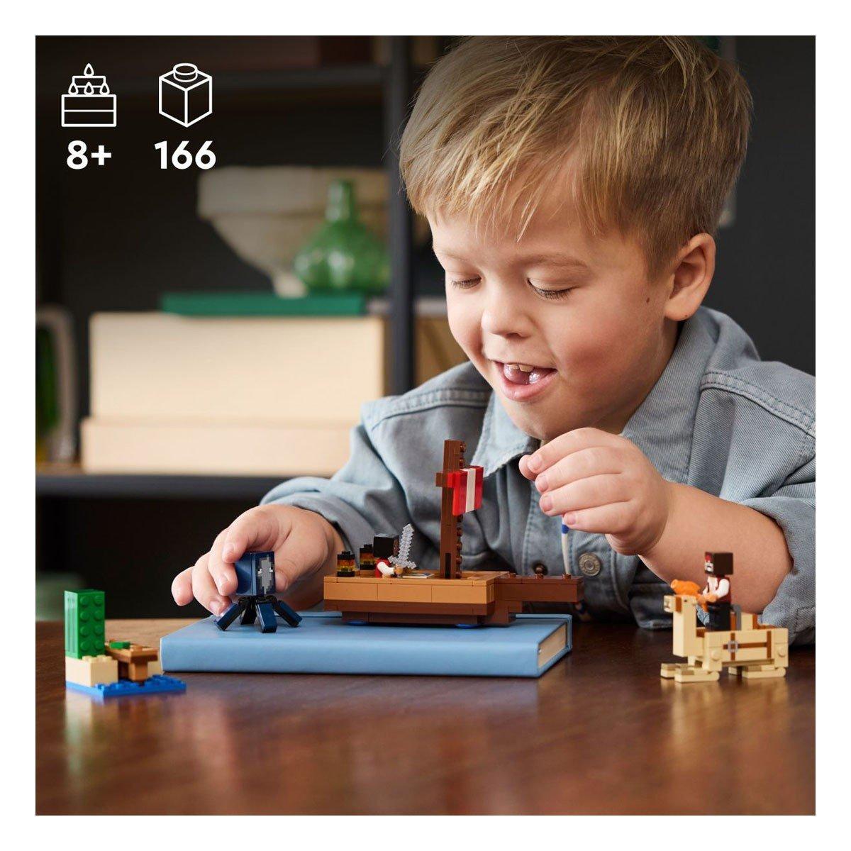 The Pirate Ship Voyage (21259) is a LEGO Minecraft pirate toy adventure set that can be played with on its own or combined with other sets (sold separately) to create a bigger play experience. This kids’ pirate ship playset makes a versatile, hands-on Minecraft gift for 8 year old boys and girls or video game players who like boat toys and building fun. This LEGO Minecraft adventure set includes a buildable pirate ship toy, plus a squid, camel, 2 pirate minifigures and accessories. Featuring pirates and a boat, and the first ever appearance of an adult LEGO Minecraft camel, this special LEGO set will appeal to Minecraft fans of all ages. The camel’s 2-seat saddle has room for both pirates to ride to their next adventure. Accessories, including a fish, map, iron sword and a cactus help inspire imaginative play. There’s digital fun too when builders use the intuitive LEGO Builder app. Contains 166 pieces.