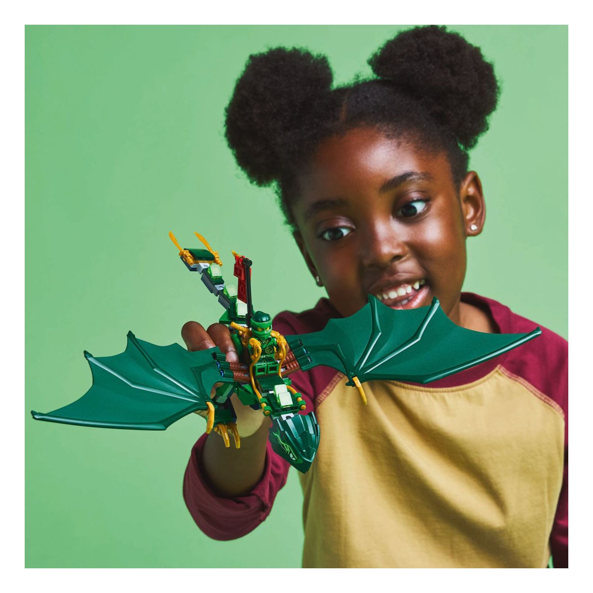 This LEGO® NINJAGO dragon set also comes with 2 minifigures: Lloyd armed with a golden katana sword accessory and a villainous Dragonian Scout warrior with an axe accessory, plus a golden Dragon Baby model so kids can enjoy exciting and nurturing role play.