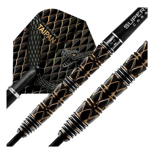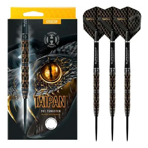 The MAGIC DARTS Harrows Taipan 23G Steel Tip Darts feature a 90% tungsten barrel with a sleek, precision-engineered grip, delivering excellent balance, control, and accuracy for competitive play.
