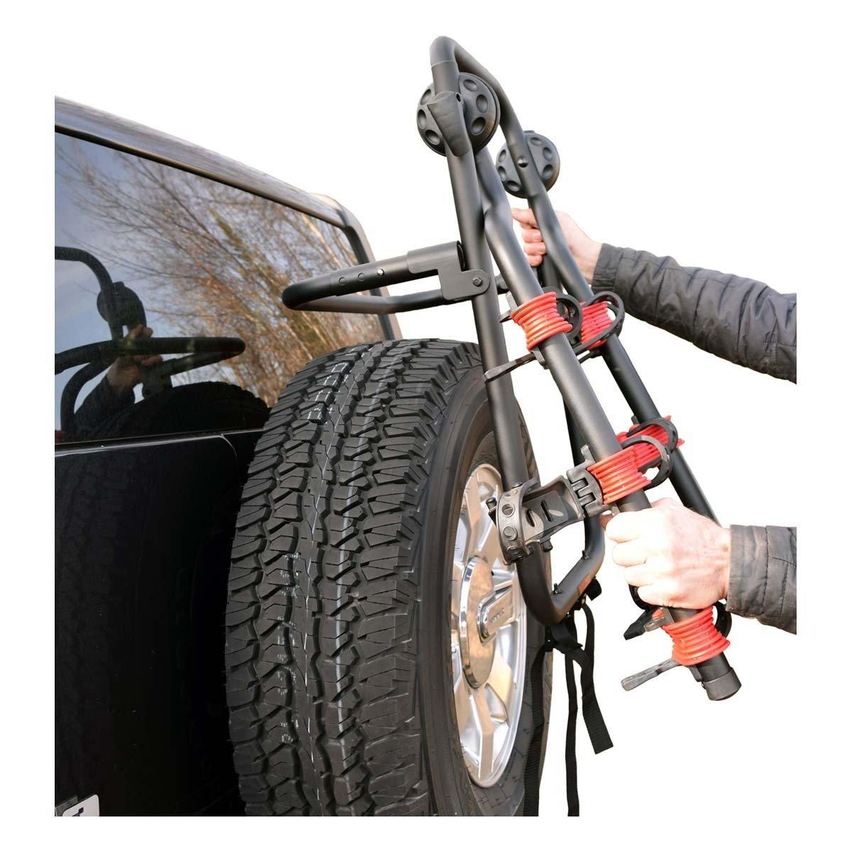 For vehicles with a rear mounted spare tire; the Hanger™ Spare T3 OS three bike carrier is our premium rack. Made of over-sized steel with soft rubber cradles and 2 webbing straps, the Hanger™ Spare T3 adjusts to fit a variety of tire widths. The arms have an offset design to accommodate tires mounted on either the right rear or left rear of vehicle. Two quick-release adjustable hubs provide arm angle selection. Folds flat when in use or for storage. Comes fully assembled with a Lifetime Limited Warranty.