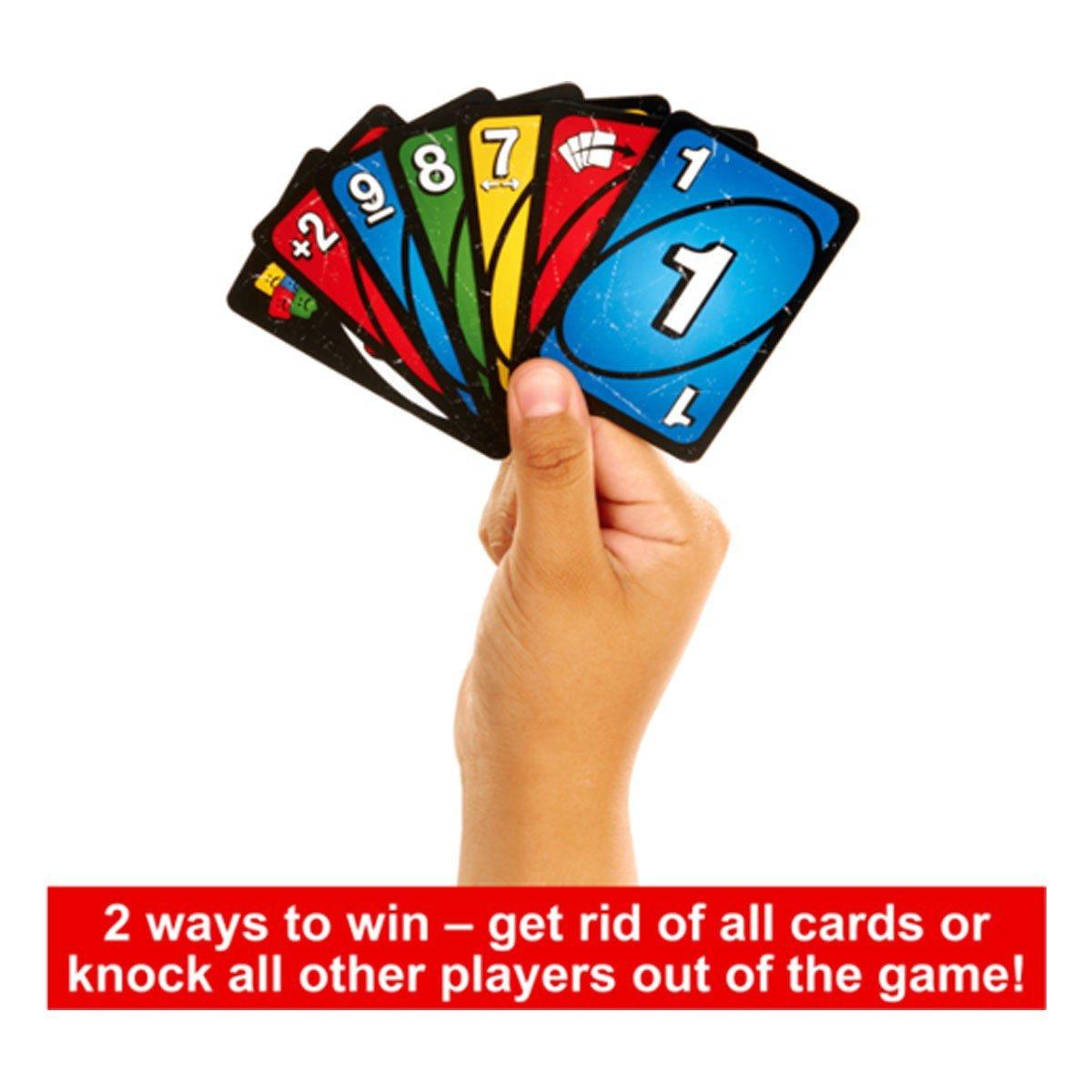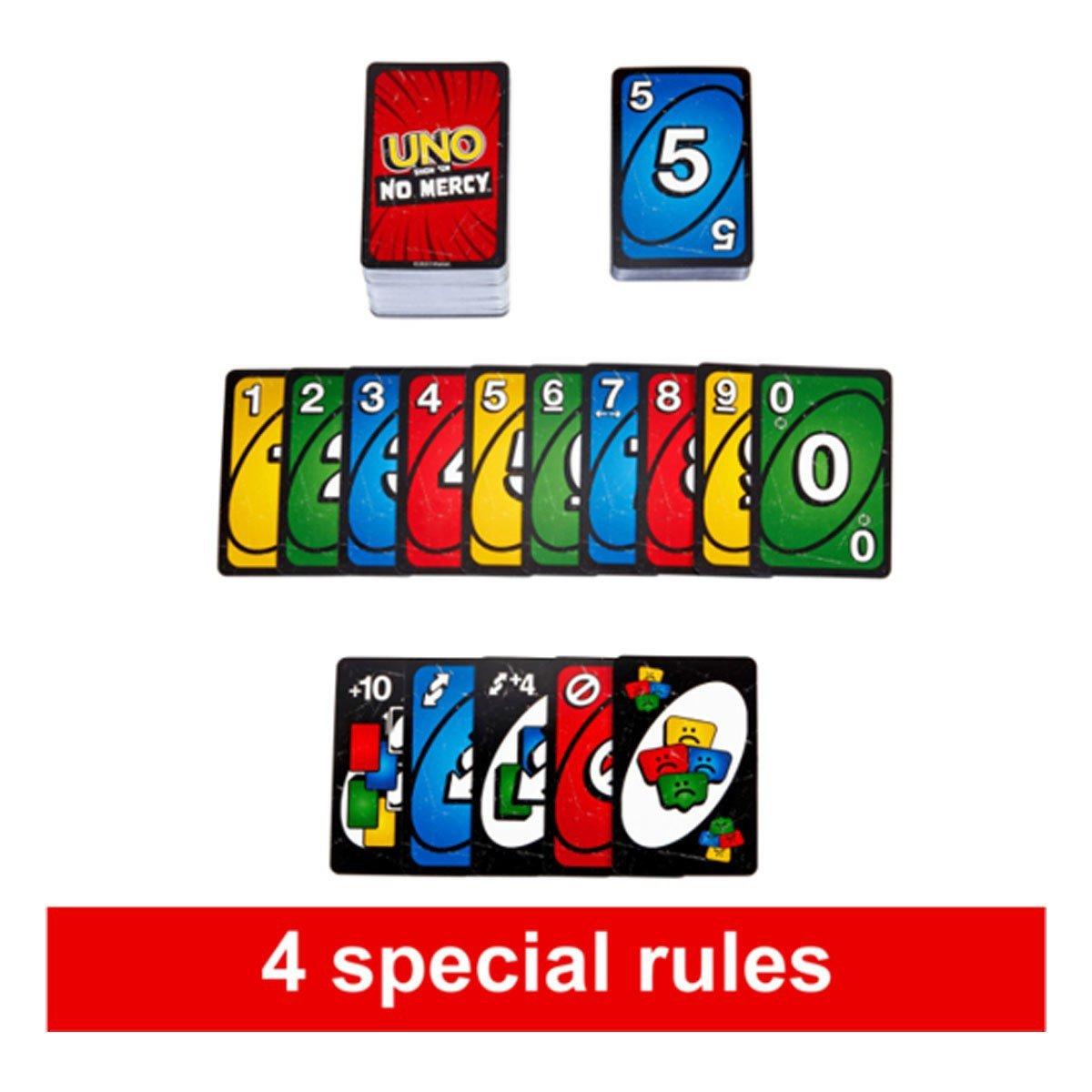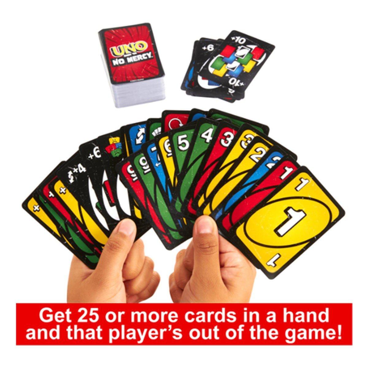UNO Show 'em No Mercy is our most brutal UNO game yet! It has a ton more cards with WAY tougher penalties (draw 10 cards anyone?) and new rules that will have players stacking, swapping and drawing more cards than ever before! And there's even a Mercy Rule (yes, we get the irony) if things get too rough. There are two ways to win in this merciless version of the classic game: get rid of all cards OR knock all other players out of the game! Oh and if you manage to get down to one card, don't forget to yell 'UNO!'