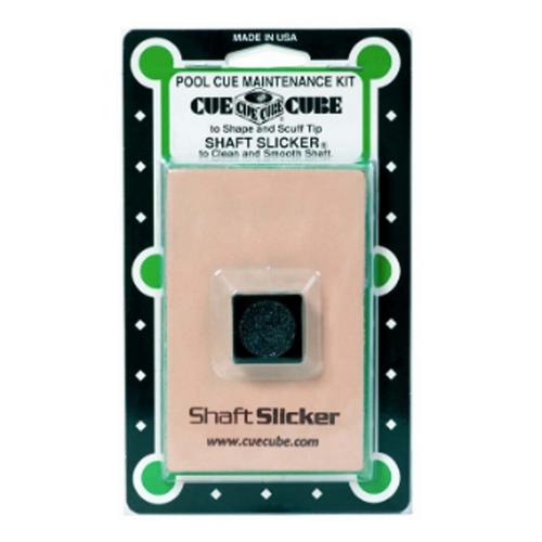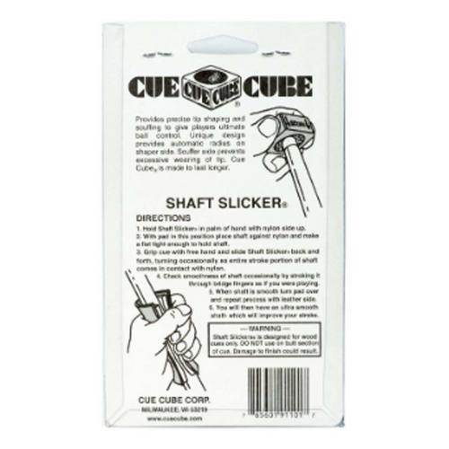 Billiard Pool Cue Shaft Slicker on Blister Card Combo. The non abrasive, cleaning side removes the dirt and oils that accumulate on the cue from repeated use. After cleaning the specially treated soft natural leather burnishes the shaft for a perfect smooth stroke.