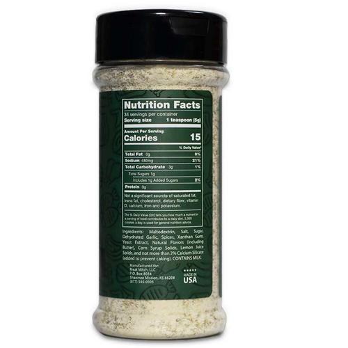 Ingredients: Maltodextrin, Salt, Sugar, Dehydrated Garlic, Spices, Xanthan Gum, Yeast Extract, Natural Flavors, Corn Syrup Solids, Lemon Juice Solids, and not more than 2% Calcium Silicate (added to prevent caking). CONTAINS MILK.