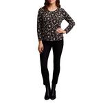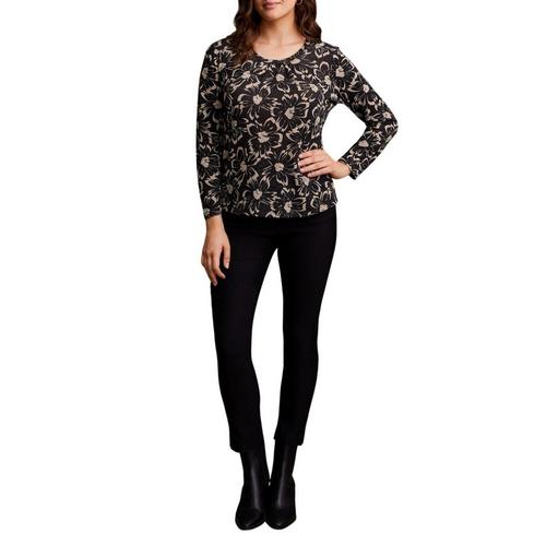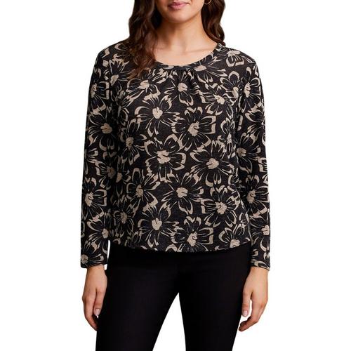 Give your casual closet a captivating twist with this long-sleeve top showing off a chic floral print design. It features a pop-over u-neck, light sirring details at the center front neckline, a shirttail hem, and melange knit fabric that stays soft and smooth throughout the day.