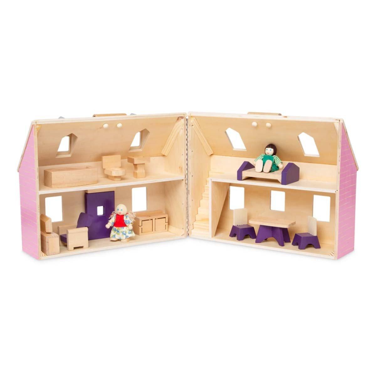 Kids can enjoy a "home away from home" with this delightful Melissa & Doug Fold and Go Mini Dollhouse. The two-story house opens wide so kids can have easy play access, and then closes back up for convenient storage and on-the-go play. The sweet house comes fully furnished and includes working doors, two flexible wooden play figures, and 11 wooden furniture pieces. Kids can have hours of pretend play as they set up their dolls for meals at the kitchen table and chairs, and enjoy a family night in the living room with a couch and television. When it's time for bed they can bring the play figures up the stairs to the second floor to the bathroom and then tuck them into the little bed. This dollhouse is made of sturdy, high-quality materials that can hold up against frequent use and everyday play. It features two sturdy wooden handles making it easy to take along on trips and play dates. The mini dollhouse makes a great gift for kids ages three and older for hands-on, screen-free play.