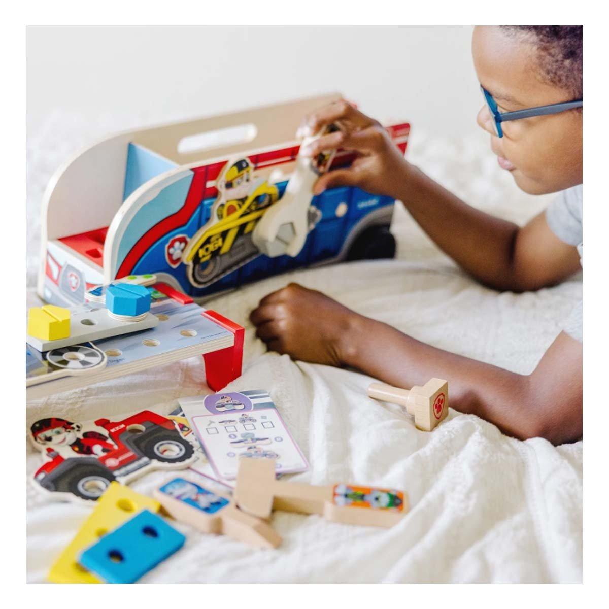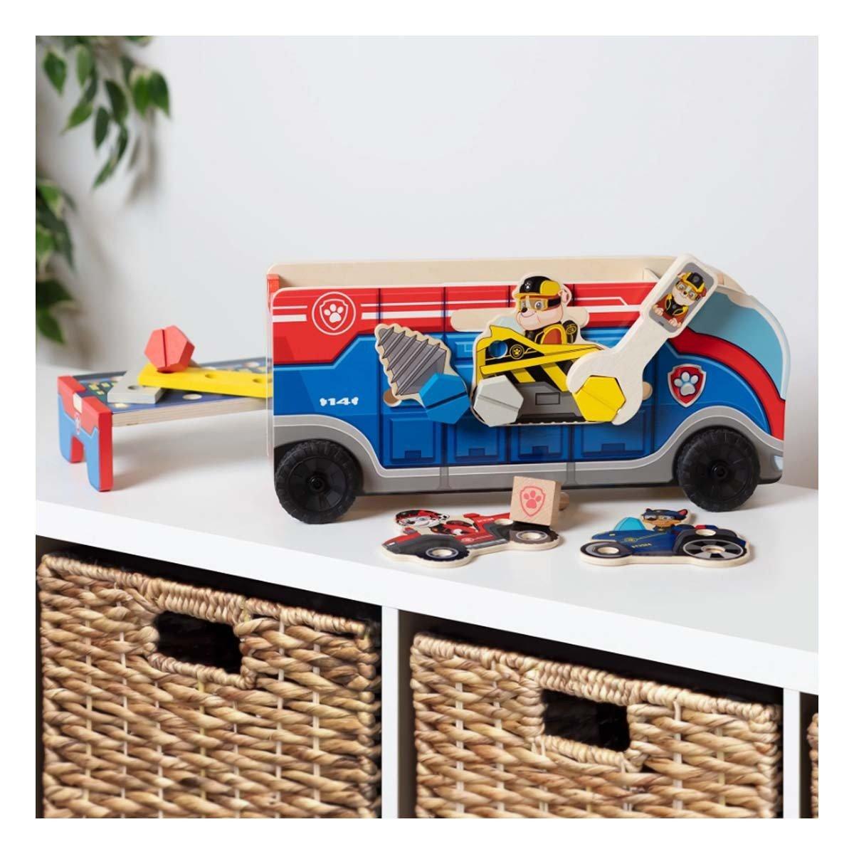 No job is too big, no pup is too small to match, build, and play with PAW Patrol™! Use the wooden character tools, hardware, vehicle panels, and building pieces to match the assembly cards, fill scenes, or create unique projects. Pieces attach to each other, the removable workbench, the sides of the cruiser, and to wooden building panels for lots of ways and places to build and play. Wooden character tools store in the cab of the cruiser and all the pieces fit inside. Wheels on the cruiser and built-in handles let kids take constructive play wherever their imagination takes them! PAW Patrol™ is always ready to help, inspiring preschoolers with a blend of teamwork, adventure, and humor as they develop social, emotional, and developmental skills through play. This product is certified by the Forest Stewardship Council. FSC certification ensures that products come from responsibly managed forests that provide environmental, social, and economic benefits, and that forests are protected for future generations. Please note that FSC certification applies to new inventory only (FSC C156584)