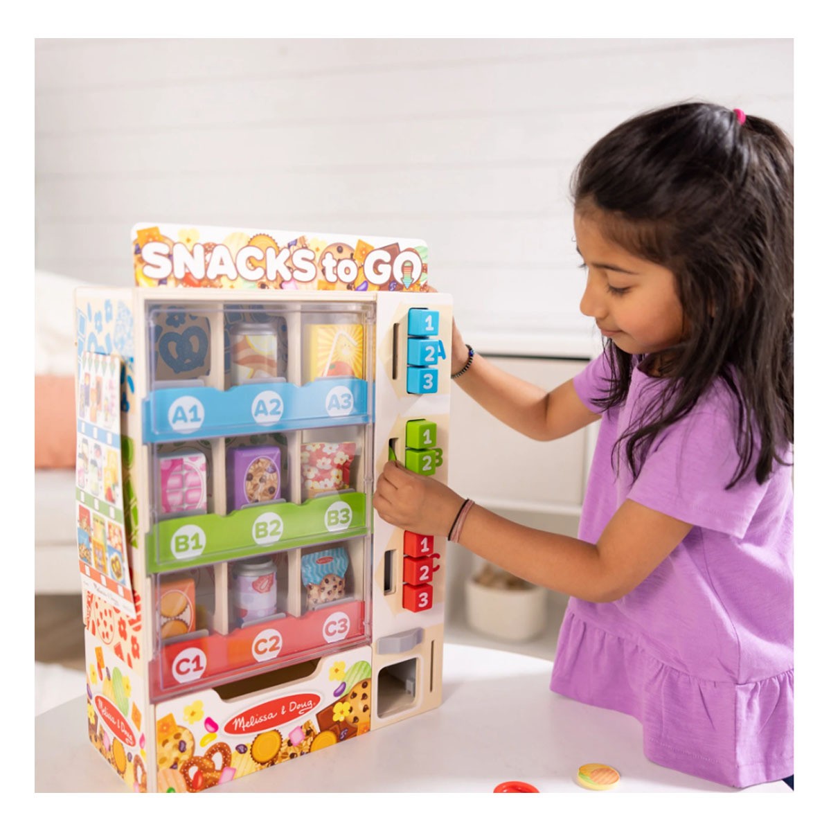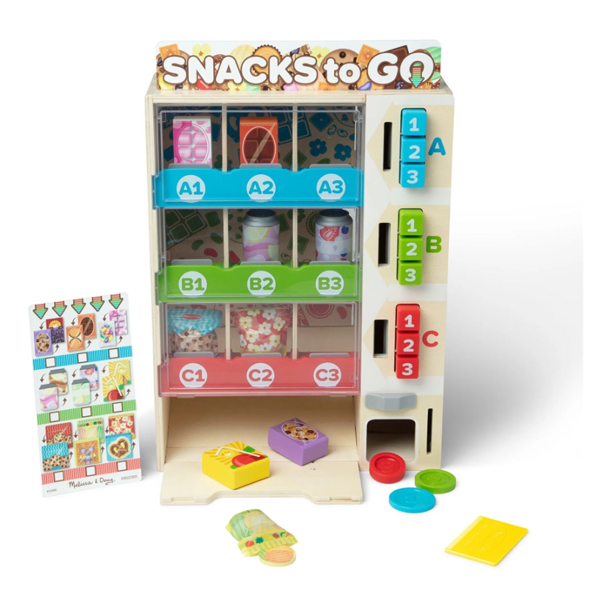 Satisfy hungry imaginations with the push of a button! Open up the back of the unique wooden vending machine and stock it with nine double-sided play food packages, including snack bars, drinks, and pouches. On the front, select an item, insert a color-matching play coin or bank card, press the corresponding letter and number button, and the snack drops into the collection drawer! No batteries required! There’s a sign that can be personalized and a reusable activity card for keeping track of what to stock and what to display. The vending machine measures 17 inches high x 12.5 inches wide x 5.5 inches deep, and requires no assembly. This vending play set is an engaging, hands-on way to help teach kids about cause-and-effect, and to encourage letter, number, and color recognition, sorting, matching, counting, and fine motor skills. All the pieces store in the vending machine for easy cleanup.