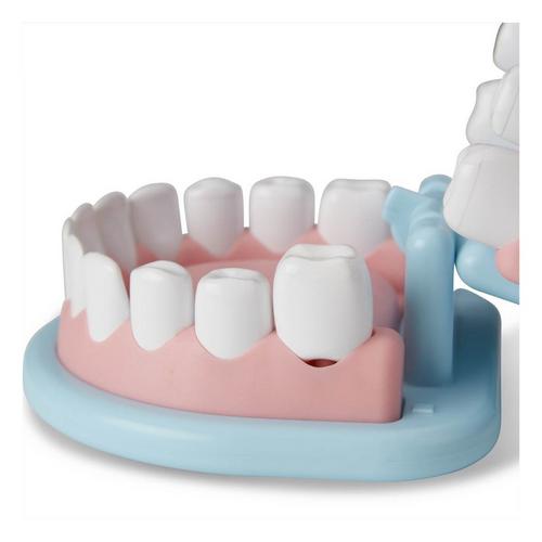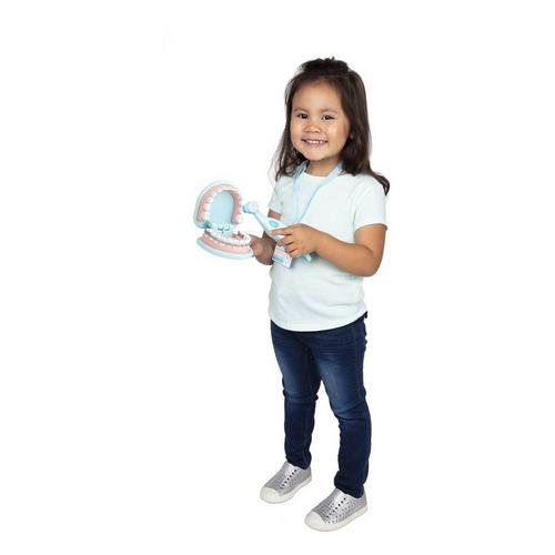 Smile, the dentist will see you now! This 25-piece dental care play set features an over-sized set of pretend teeth so young dentists-in-training can give cleanings, treat cavities, and even fit retainers and braces! Mark the pretend teeth with "cavity" stickers, then use the vibrating tool with interchangeable polishing and drill heads, and the toothbrush to clean. The set includes realistic instruments like a pick, mirror, and floss, a dental rinse bottle and cup, 2 gauze pads, 2 tooth polish cups, and an instrument tray to keep organized. A mask, reusable ID tag on a lanyard, and a double-sided reusable activity card round out the dentists office experience. The play set is a fun and engaging way to teach good dental health practices, and to ease kids fears or feelings of stress associated with a visit to the dentist. Spark a childs creativity and imagination, and to inspire young dentists for years to come.
