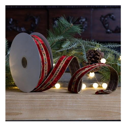 Embellish your home decor items, gift wrap, craft projects, and more with this beautiful Wired Holiday Ribbon. Measuring 1.5"x10 yards in length, the roll of ribbon features a jeweled design. The classic red and gold tones paired with quality polyester and iron wire composition is the perfect combintion to create a stunning holiday display. Use this ribbon to make hand-tied bows to adorn onto your Christmas presents or holiday wreaths, or embellish your Christmas tree with a trailing ribbon garland.