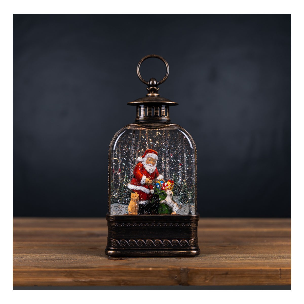 Illuminate your home this Christmas season with the stunning Lighted Snow Globe Lantern with Santa and Dog. This piece features a whimsical Santa scene with toy bag and dog accents. The antique lantern design paired with the sparkley globe contents makes this set a great addition to any style of holiday decor. The piece also features a 6-hour timer function to save you the hassle of turning it on and off. A USB charging cord is included with purchase.