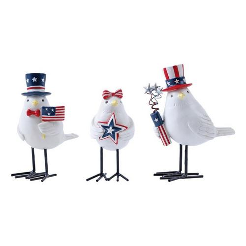 Get your home ready for year with this beautiful set of Americana Birds. Featuring three designs, this set is sure to add a whimsical touch to your Independence Day or Memorial Day decor. The bold red, white and blue tones paired with the adorable bird characters with hat and firecracker accents is the perfect combination to create a stunning display. The quality polyresin composition is sure to last for seasons to come. Display the pieces together on a mantle or bookshelf to make a statement, or display them alongside other decor to add interest to your space.