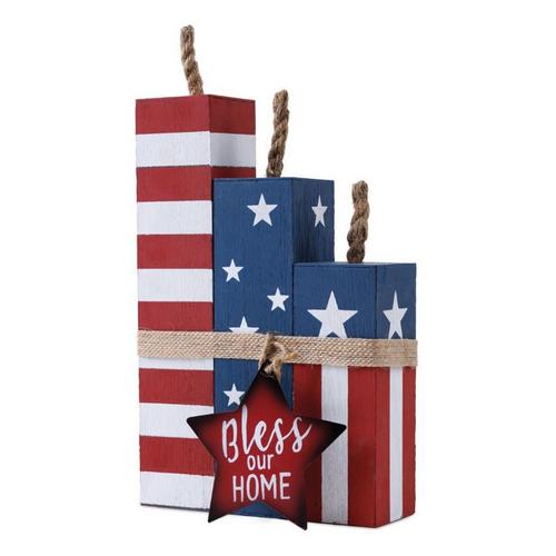 Get your home ready for year with this beautiful Americana Firecracker Bundle. Measuring 14" in tall and feature three wood blocks in a bundle, this piece is sure to add a rustic yet vintage touch to your Independence Day or Memorial Day decor. The patriotic red, white and blue tones paired with the sentiment "Bless this Home" is the perfect combination to create a stunning display. The quality solid wood composition is sure to last for seasons to come. Display the piece on your living room mantle or use them as a table centerpiece to make a statement in your home today!