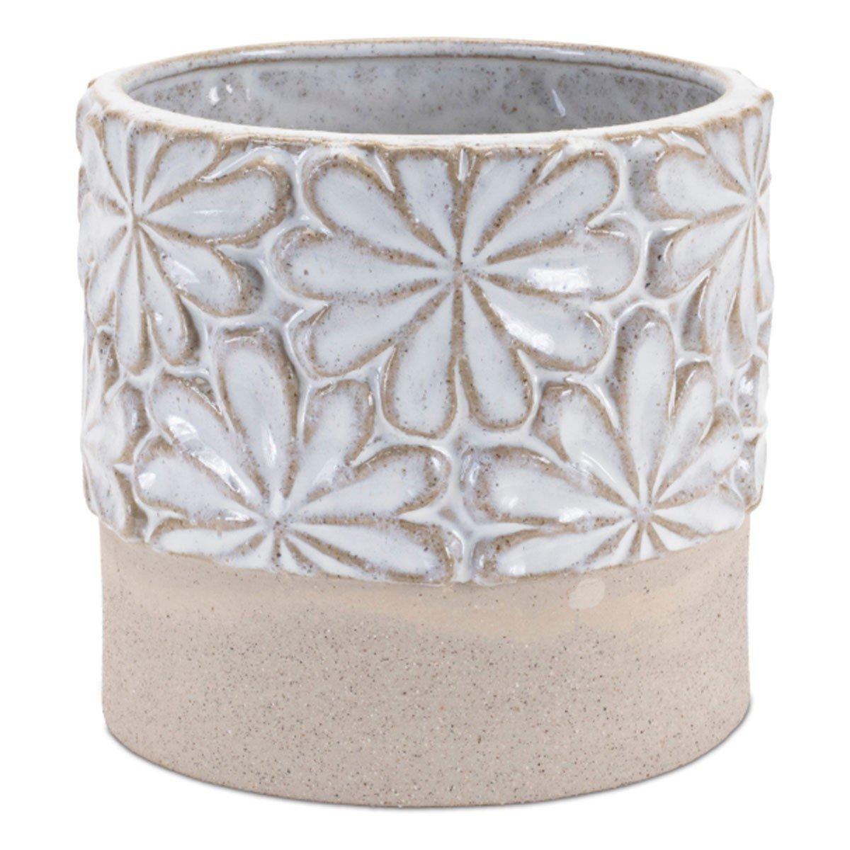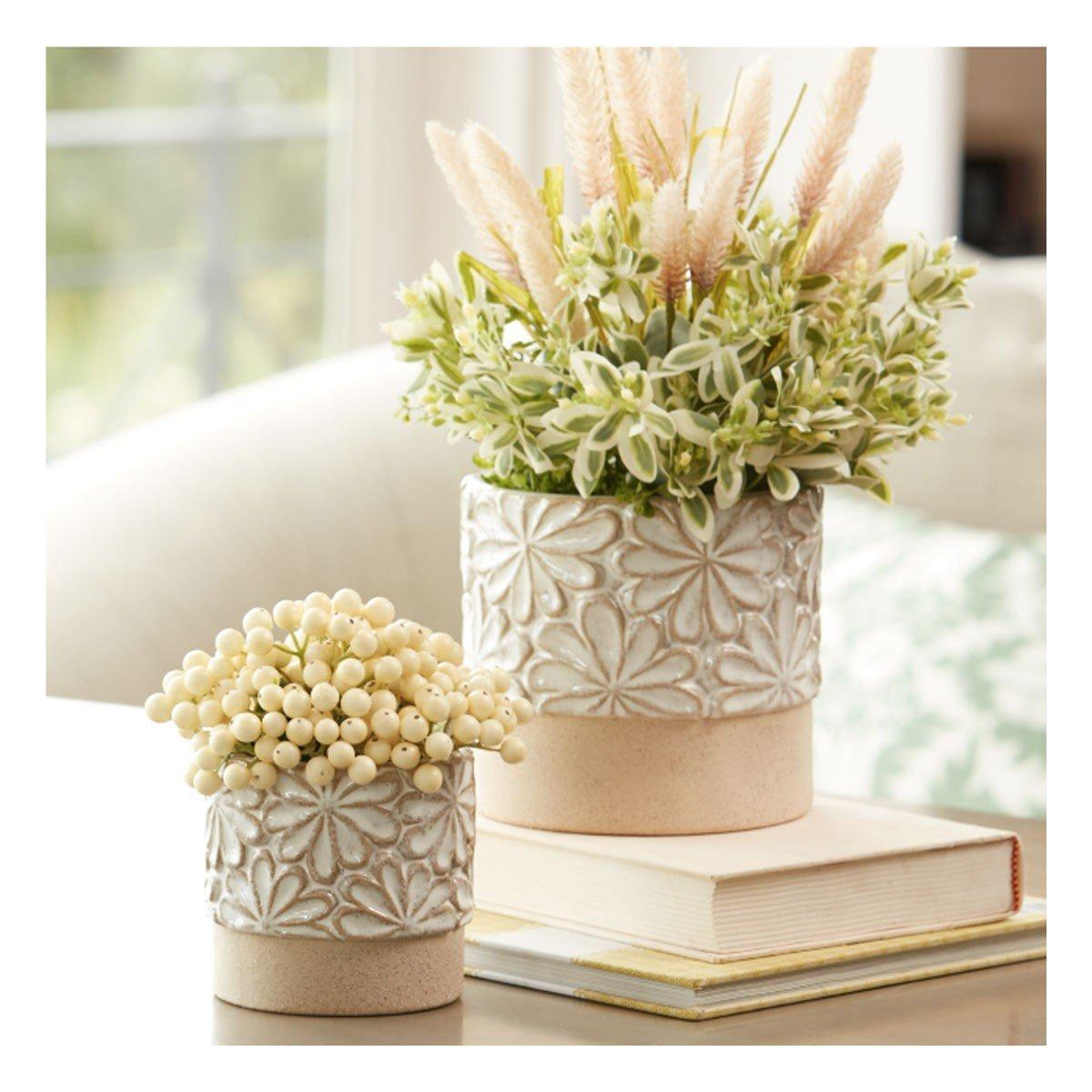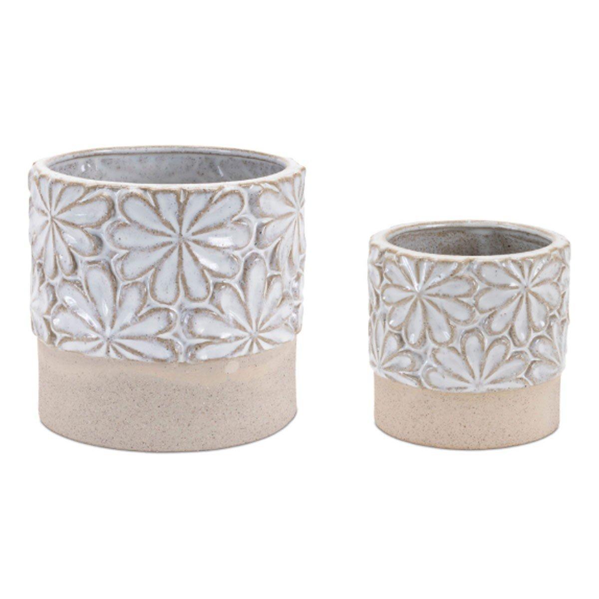Let your indoor plants flourish with this stunning set of Ceramic Planters. Featuring two assorted sizes, the cool grey and beige tones paired with the elegant floral design and rustic unglazed base accent are perfect to create a memorable display. The quality ceramic composition is sure to endure for seasons to come. Insert a live plant or bundle of faux florals into each planter to complete the look, or gift these pots to a fellow plant-lover in your life to share the beauty!