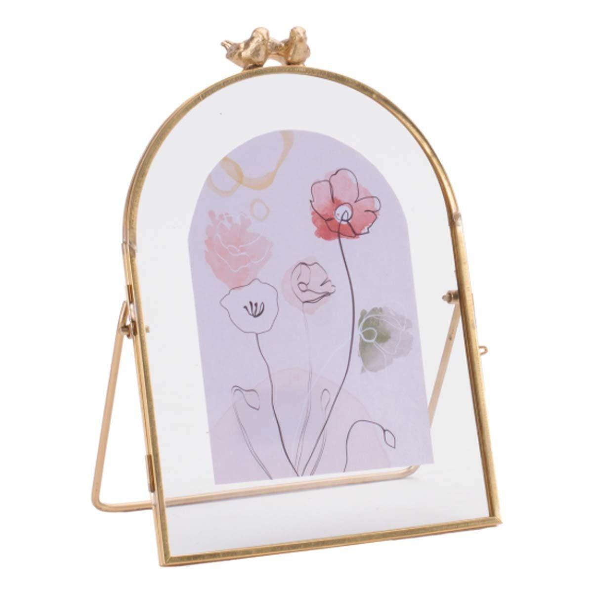 Add a touch of elegance to your decor with the Copper Framed Floral Artwork with Bird Accent. Featuring a chic gold arched frame, this artwork showcases a delicate blend of soft pink and green tones in a modern floral sketch and watercolor design. The intricate bird accents perched atop the frame lend a unique charm, making it a perfect piece for any table or shelf. With its foldable easel back, this framed art is ideal for display in your living room, bedroom, or office.