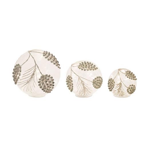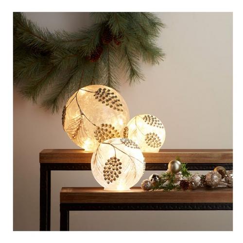 Illuminate your home holiday decor with this set of lighted pine cone globes. Featuring a set of three, these beautiful glass globes will help add to a stunning Christmas display. Batteries sold separately.
