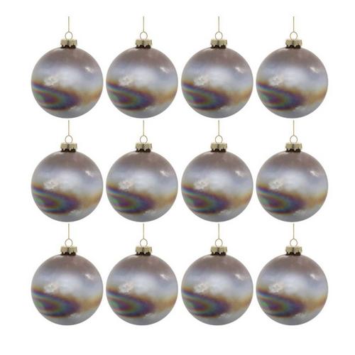 Enhance your holiday décor with this set of Iridescent Glass Ball Ornaments. Designed in wintry brown and gray tones with a chic iridescent finish, these ornaments exude a soft, shimmering glow that adds depth and elegance to any space. Featuring a traditional ball shape with a cloudy glass design, they offer a modern twist on a classic look. Finished with a gold ornament cap and delicate string hanger, this set of 12 ornaments are perfect for Christmas trees, wreaths, or garlands, bringing contemporary holiday cheer to your seasonal displays.