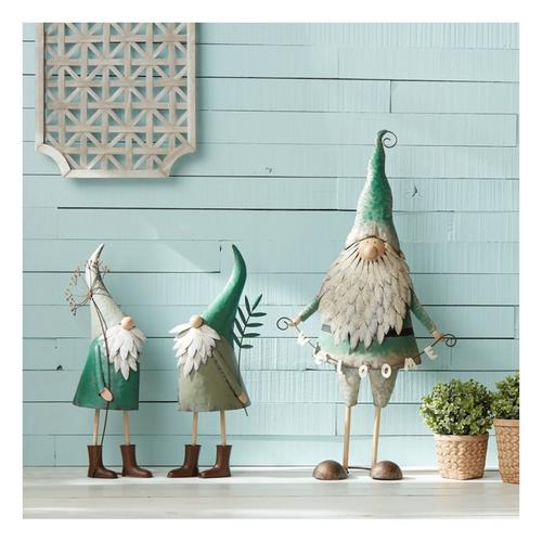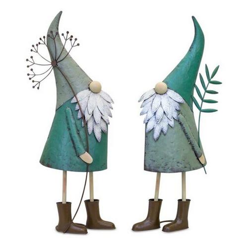 Welcome guests to your yard or garden with this adorable set of Yard Gnome Figurines. Featuring two assorted designs, the bright teal color paired with the rustic metal finish makes this set a great addition to your spring decor. Its sturdy iron metal composition is sure to last for seasons to come. This set is reccommended for both indoor and outdoor use. Featured in Melrose International's "Cottage Garden" collection.