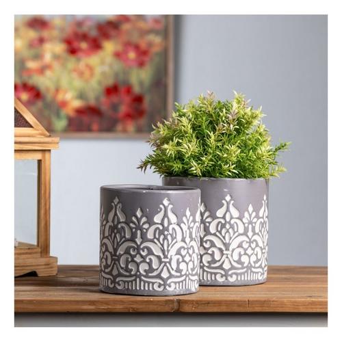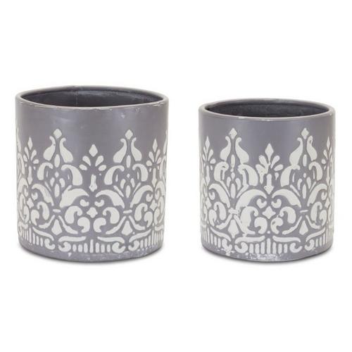 Stop wasting time finding the perfect planter for your plants! Get the look you want with our stylish set of Metal Planters. Beautifully distressed grey tones with white accents in a ornate pattern design, these durable metal planters will bring a luxurious touch to your home and garden. Show off your plants in style and enjoy to ambiance of nature inside your home. Complete the look by adding a faux potted foliage, succulent, or floral plant to each planter.