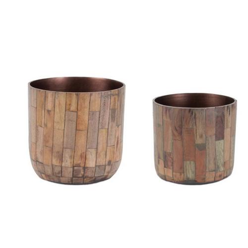 Enhance your indoor space with the Round Wooden Planter Set. Featuring natural brown tones and beautiful wood grain finishes, these planters are lined with chic bronze metal accents for a modern touch. Sold in a set of two assorted sizes, these planters are perfect for displaying real or faux plants. Ideal for indoor use, these planters add a natural, contemporary charm to your home, complementing modern and contemporary decor styles.