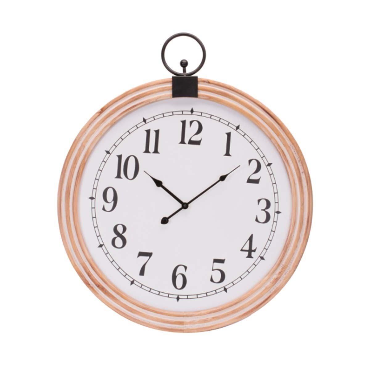 Enhance your home with the timeless appeal of this round wooden wall clock. Featuring a classic white clock face with bold black numbers and hands, it offers a striking contrast that makes it easy to read from any angle. The natural wood grain frame with trendy white-washed grooves adds texture and charm, while the traditional round shape ensures it complements any décor style. Perfect for modern, traditional, or rustic interiors, this clock brings both style and function to your walls. Requires 1 AA battery (not included).