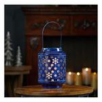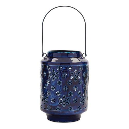 Bring the cozy charm of winter indoors with this 9.5" snowflake punched metal candle lantern. Finished in a rich navy blue glaze, this round iron lantern features delicate snowflake cutouts that cast festive patterns of light when paired with your favorite 4" pillar candle (not included). Its wintry design and subtle shine make it a perfect accent for mantels, holiday tablescapes, or entryway décor. Whether you're decorating for Christmas or creating a seasonal glow, this lantern adds a magical touch of warmth and wonder.
