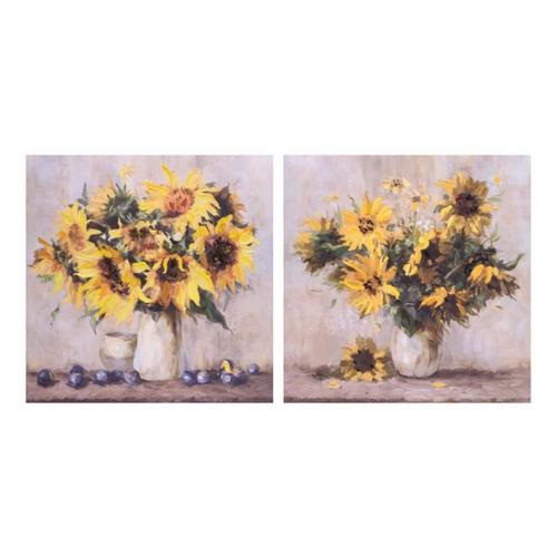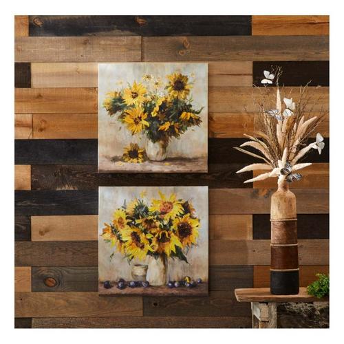 Add a touch of modern elegance to your decor with the Sunflower Vase Canvas Wall Art. This set of two assorted designs features vibrant yellow and green tones, with a focus on sunflower florals arranged in a modern vase on a tabletop. The unframed canvas showcases textured accents for added depth and richness, creating a dynamic visual effect. The piece comes with two D-ring hangers on the back for securing it safely to the wall of your home. With its cheerful sunflowers and fresh design, this art set brings a serene, natural feel to your living space, entryway, or office.