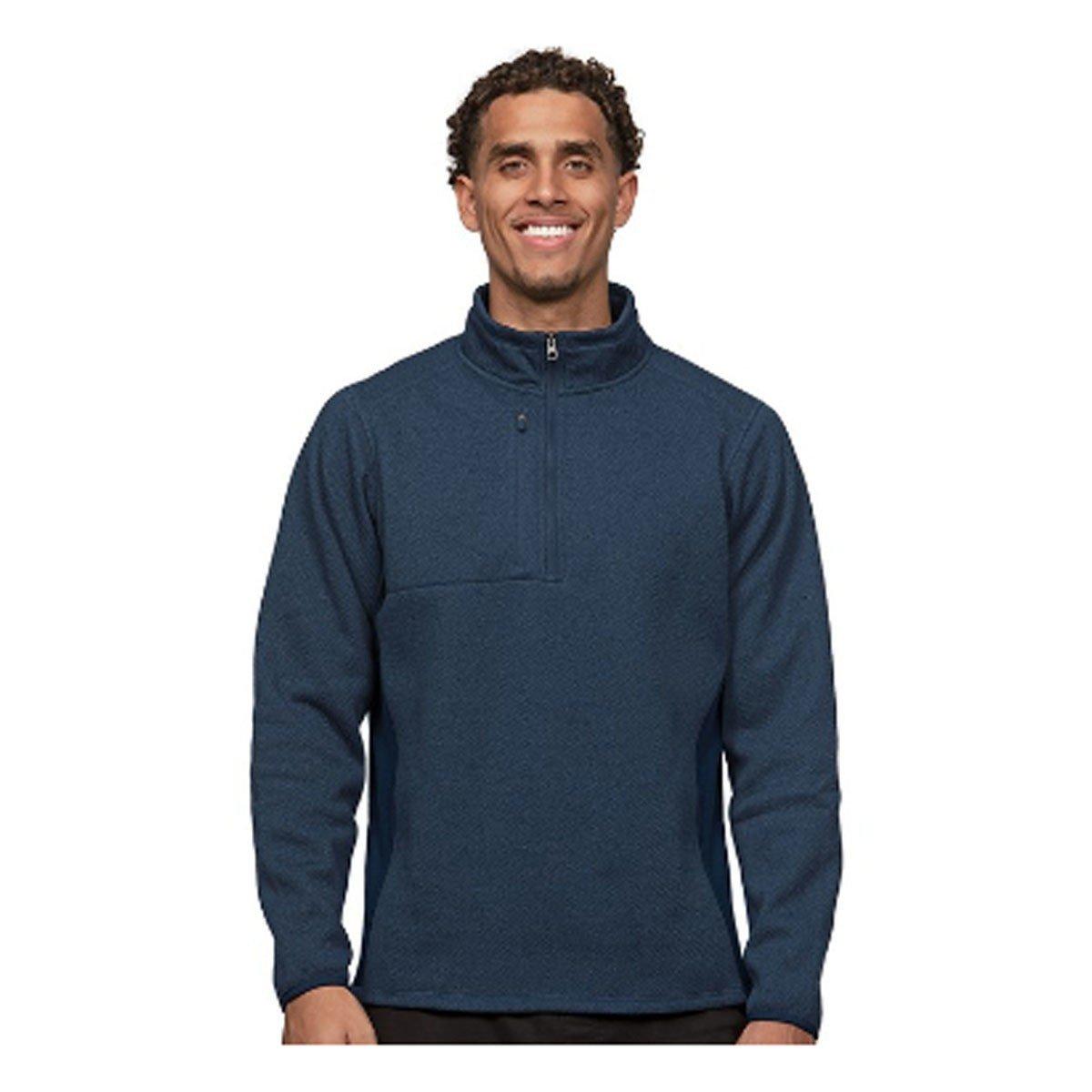 100% Polyester heath honeycomb pattern quarter zip pullover with solid jersey face fleece back insets. Chest pocket at wearer's right side with zipper. Open cuff and bottom hem. Cut and sew shoulder forward detail.