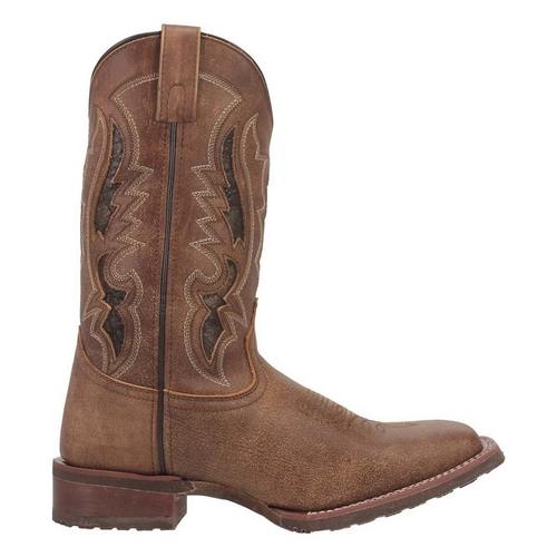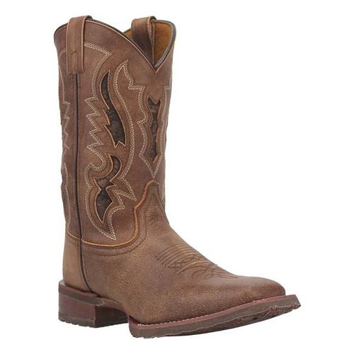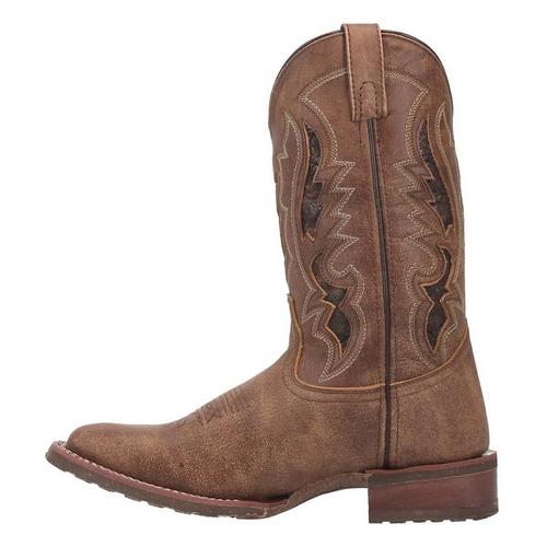 The Laredo Martie boot is constructed of soft tan leather and is set apart by the dark brown underlay design on the upper. The underlays are outlined by multi-row stitching. Features broad square toe, Ortholite cushion insert, stockman heel and lightweight rubber outsole.