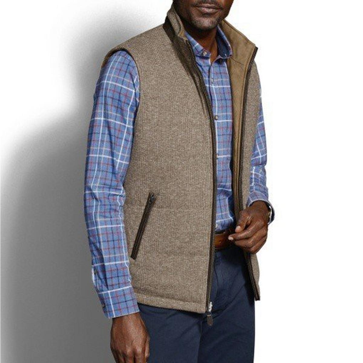 •Quilted side with welt pockets, Plaid side with zip pockets; both trimmed with faux leather.