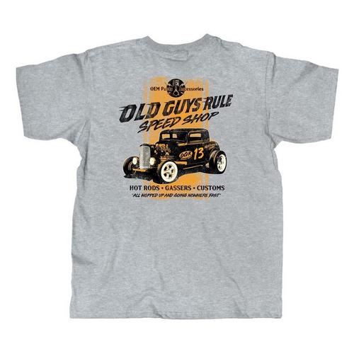 Rev up your wardrobe with the Men's Old Guys Rule Speed Shop T-Shirt, a tribute to classic car culture and the timeless spirit of speed enthusiasts. Crafted from premium, breathable cotton, this shirt offers unbeatable comfort whether you're cruising down the highway or tinkering in the garage. The vintage-inspired Speed Shop graphic on the front proudly declares your passion for horsepower and nostalgia. Perfect for car aficionados or as a thoughtful gift for the gearhead in your life, this tee is a stylish nod to the golden age of motorsports.