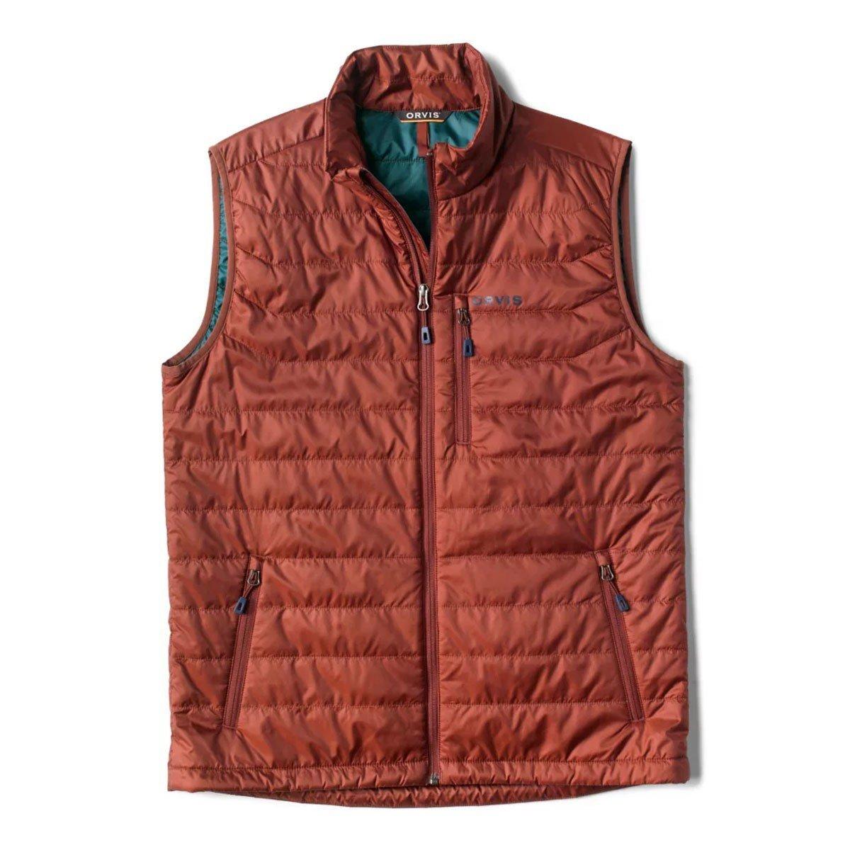 Lightweight warmth is critical when layering for colder weather. To achieve that, we created our most eco-friendly, insulated outerwear yet. The DWR-treated shell is made of 100% recycled polyester in a rugged ripstop weave; the insulation uses 100% post-consumer recycled fibers. The ultimate synthetic insulation for warmth-to-weight ratio, bluesign®-approved, top-of-the-line, packable 60G PrimaLoft® Gold retains warmth even when wet. Soft, tricot-lined (and zipped) handwarmer pockets provide extra protection from the cold, as does the cinch at the waist. Chevron-quilted with a stand collar and a chest pocket. The vest stuffs into its internal zipped pocket. Active fit.