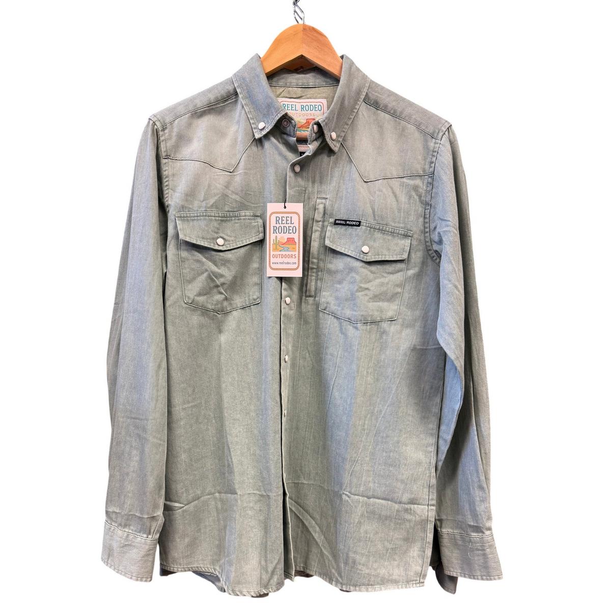 Men's Reel Rodeo Outdoors Sage Washed Denim Pearl Snap Long Sleeve Button Up Shirt