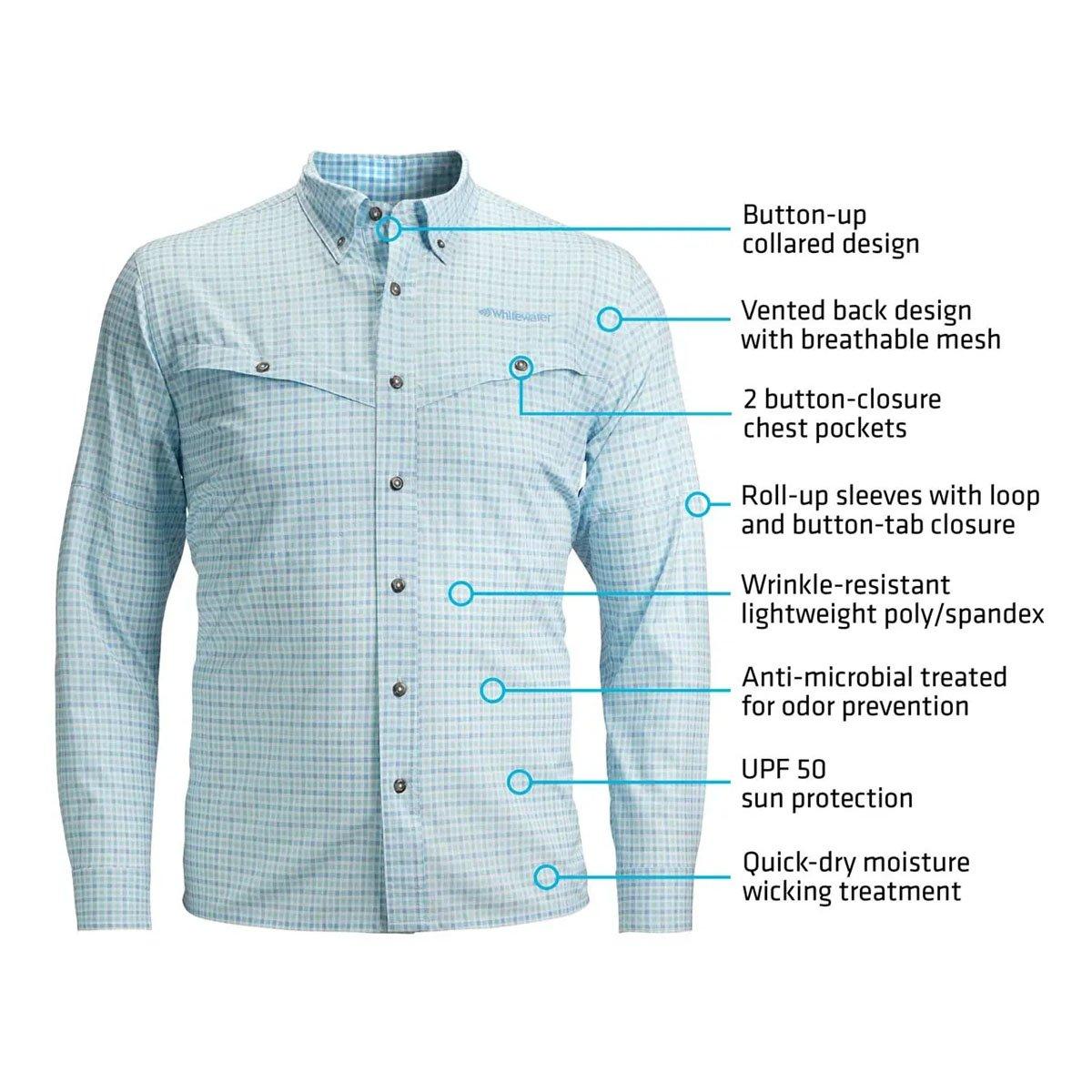 Our long sleeve fishing shirts are made for functionality without sacrificing any comfort. The lightweight poly-spandex blend and relaxed fit offer flexibility, breathability, and wrinkle resistance for when you need it most. Stay cool, dry, and protected against UV rays with our Men’s Whitewater Rapids Fishing Shirt.