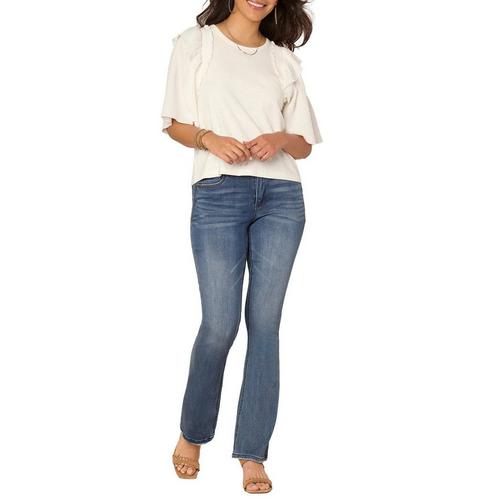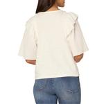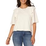Add a fresh feminine vibe to your wardrobe with this mixed media top, featuring smocked short sleeves with ruffle shoulder details and a round neck. Whether you pair it with jeans or a skirt, this versatile top brings a touch of flirty charm.