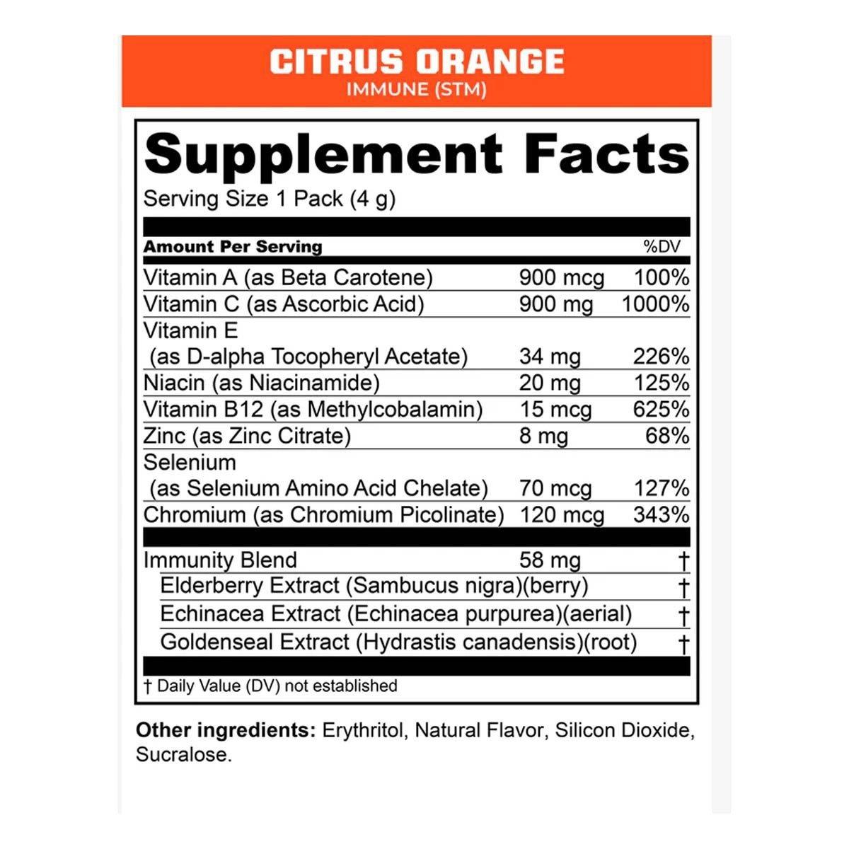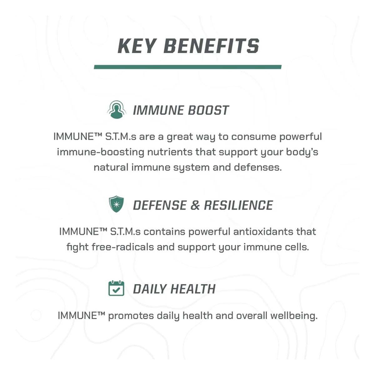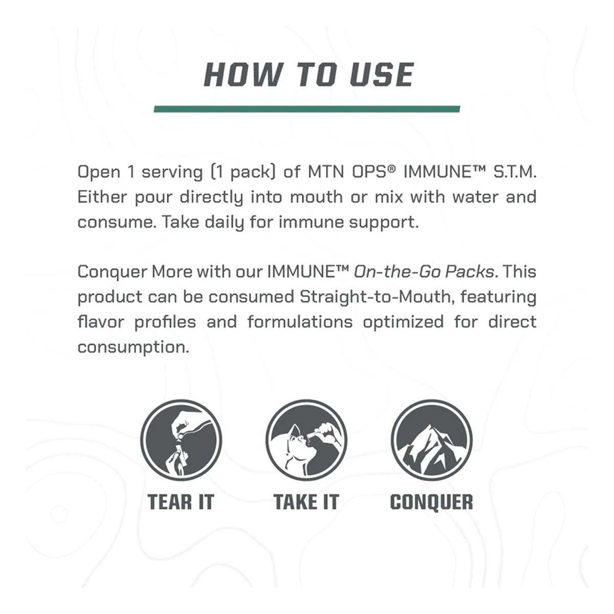MTN OPS® IMMUNE™ is an enhanced daily immune support formula in stick packs optimized for straight-to-mouth consumption. IMMUNE works to support your body with ingredients like Vitamin C, Zinc, and powerful antioxidants to give you daily immune support during any season.