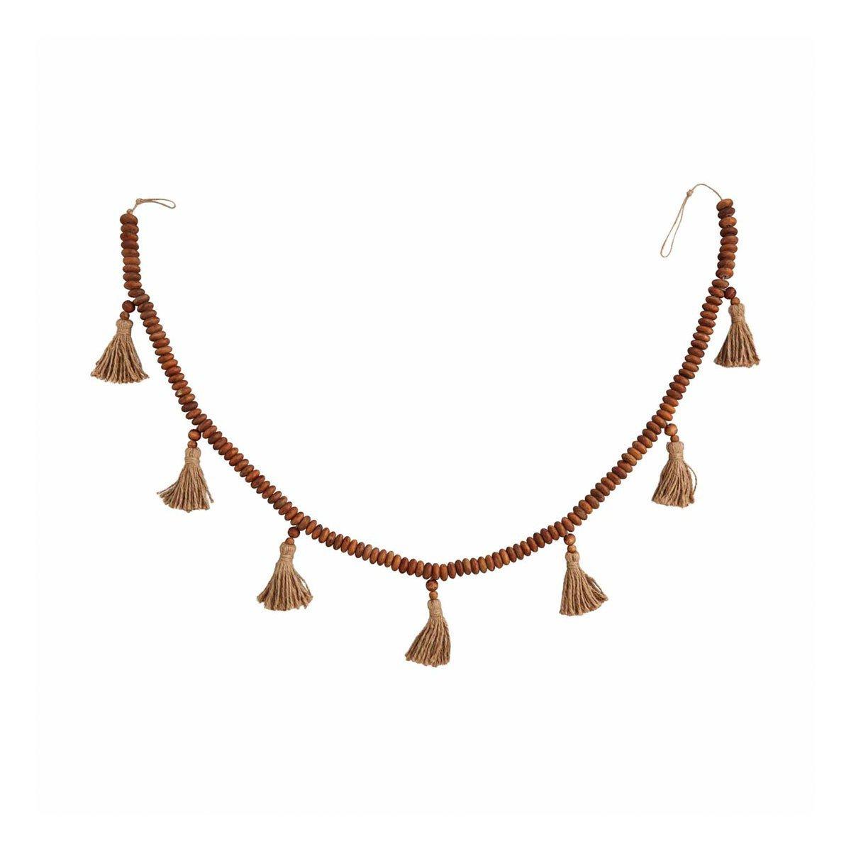 Our beaded tassel garland can be used in your home year round. The beaded garland is made of the classic mango wood. The garland features jute tassels throughout the garland, with the tassels hanging down from other beads.