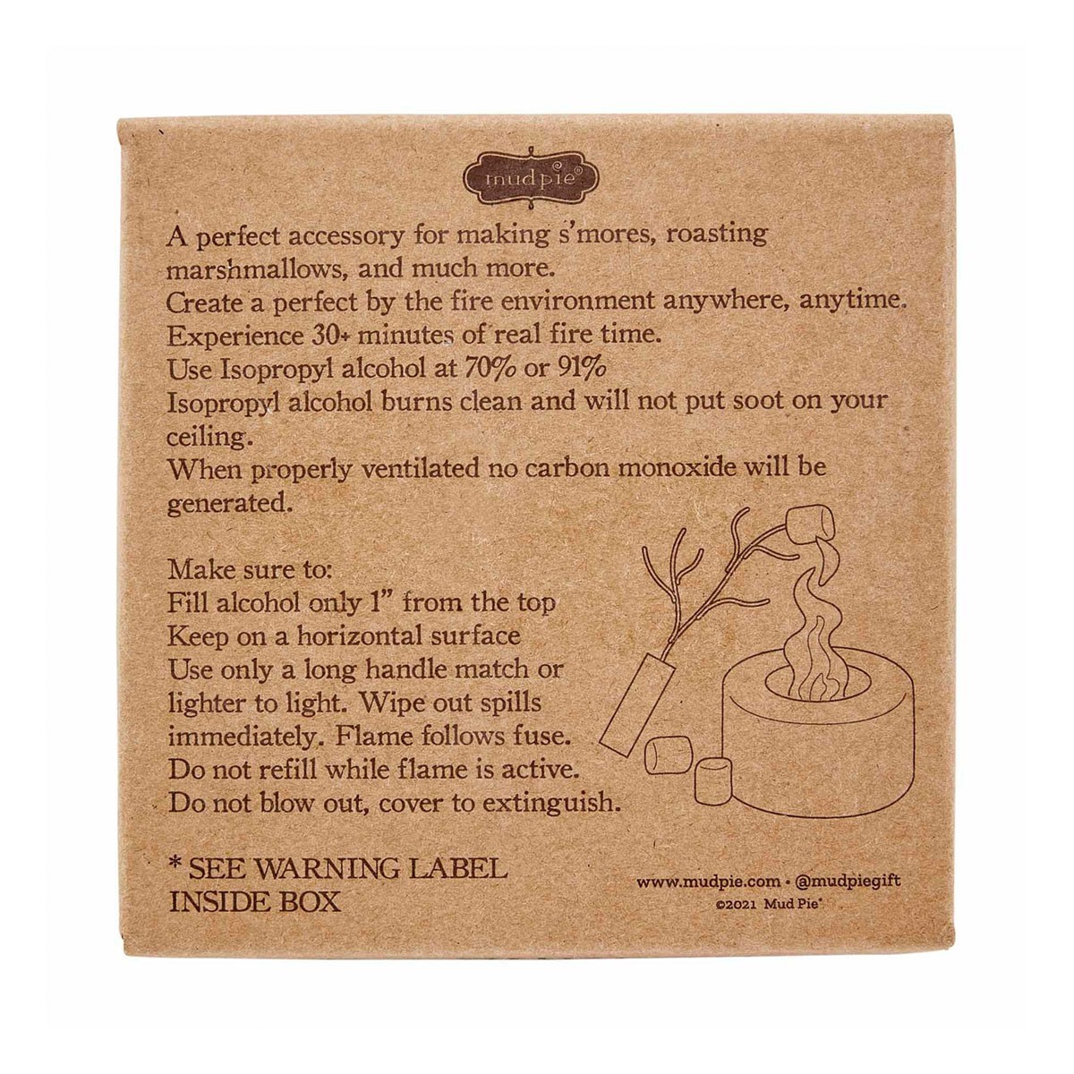 Add the Mud Pie Marshmallow Roasting Set to your fall decor. This two piece set comes with a concrete tabletop mini firepit and a wood and metal wire roasting skewer. Fueled by isopropyl alcohol, this Mud Pie Marshmallow Roasting Set is perfect for roasting marshmallows indoors without creating carbon monoxide if ventilated properly. Detailed instructions are also provided on how to get your mini roasting set up and running in no time. Add a perfect fall piece for the whole family to use with the Mud Pie Marshmallow Roasting Set.