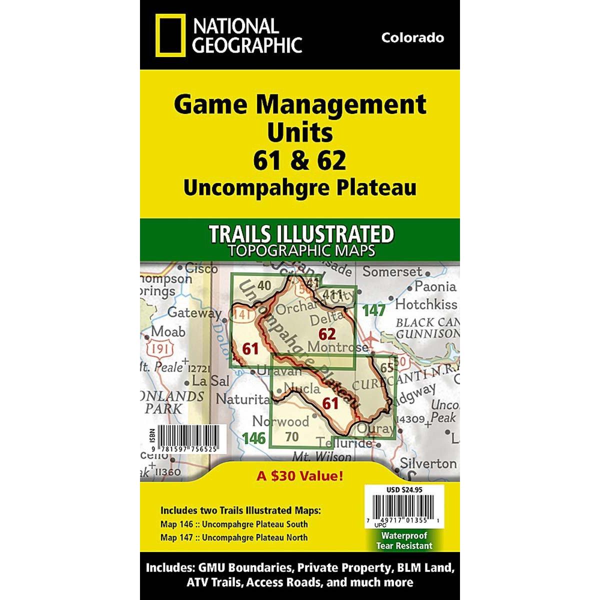 Colorado uses Game Management Units (GMUs) to describe hunting boundaries. National Geographic has created Map Pack bundles to aid hunters with planning and backcountry use. This Map Pack covers the Uncompahgre Plateau by bundling two maps to cover the entire area. The GMUs covered are 61 and 62. The maps include GMU Boundaries, Private Property, BLM Land, ATV Trails (outside of wilderness areas), Access Roads, and much more.