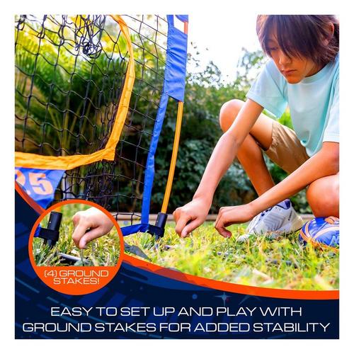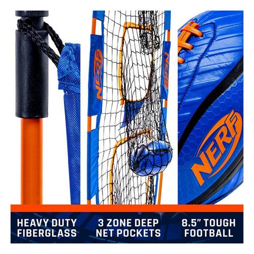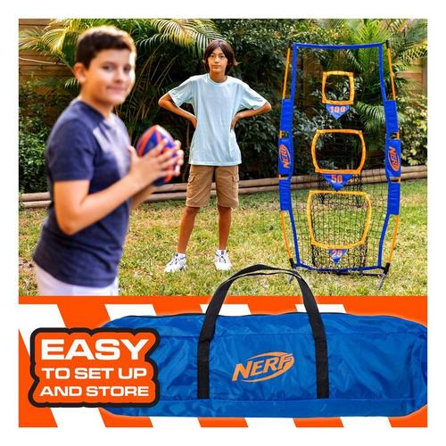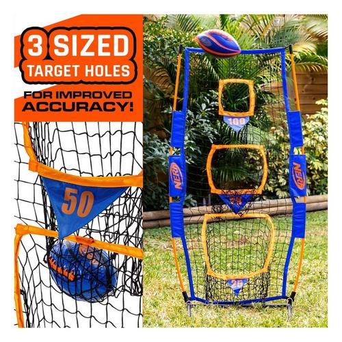 Throw like a pro with the NERF Pro Pass Football Target! This net helps players of all ages develop their throwing accuracy with the 3 targets built into the net. With the heavy-duty construction and ground stakes it is perfect for the practice field or the backyard. This set includes an 8.5" football and carrying case for easy storage. So, get out on the field and improve your skills with the NERF Pro Pass Football Target!