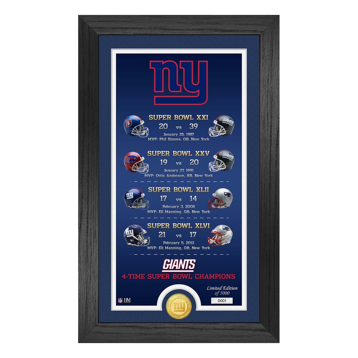Proudly display your New York Giants spirit with the New York Giants "Legacy" Bronze Coin Photo Mint. Whether you’re a collector of all things New York Giants or want to display your pride, this piece of New York Giants memorabilia will help you do just that. From the home to the office, this NFL collectible will help you show off your team pride. With the New York Giants "Legacy" Bronze Coin Photo Mint, no one will doubt your favorite NFL team.