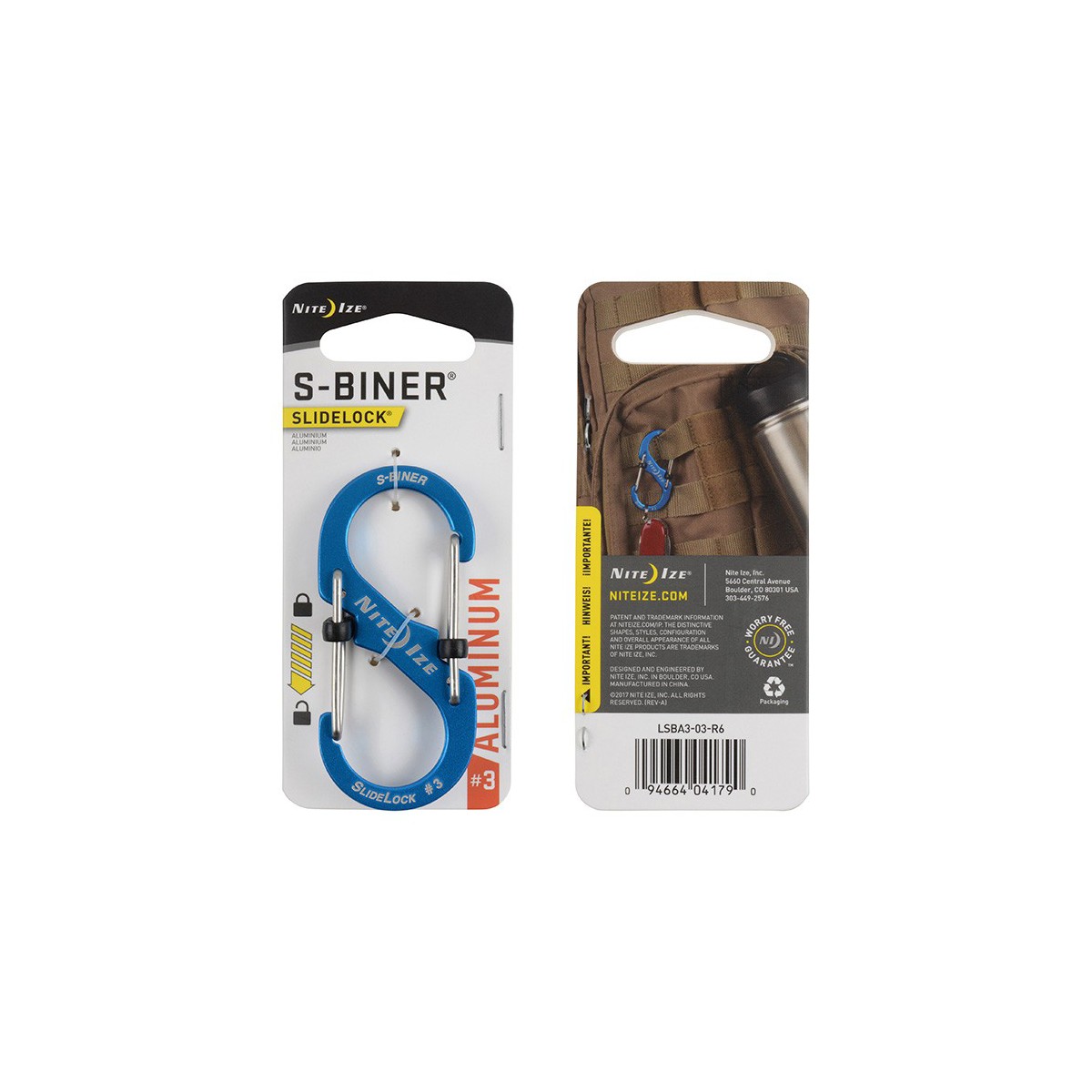 Organize, connect, carry, and keep your valuables extra secure with the colorful, aluminum S-Biner SlideLock Dual Carabiner. Made of high quality, lightweight aluminum, the S-Biner SlideLock features two simple, innovative plastic sliders that slide into place to keep the stainless steel gates securely closed. Each gate can be locked independently for convenient access. The S-Biner gates will stay firmly locked until you choose to unlock them, allowing for simple and secure linking, attaching, and carrying. Our S-Biner SlideLocks are available in three sizes (#2, #3, and #4) for small-to-larger tasks. Solid aluminum construction Secure stainless steel wire gates with slide-to-lock feature Gates can be locked independently Lightweight and strong Size # 3: Dimensions: 1.2" x 2.7" x .4" | 31mm x 68mm x 11mm Weight: .3oz | 9g