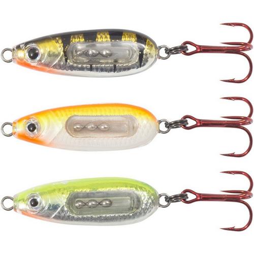 The Northland Glass Buck-Shot Rattle Spoons are one of the best minnow imitating jigging spoons available. Made from metal and featuring a noisy Buck-Shot Rattle, these spoons will lure fish in from a wide radius and entice fish to bite no matter the time of the year. Including three Buck-Shot Rattle Spoons per pack, you'll be ready to vertical jig for perch, walleye, trout, bass, and pike.